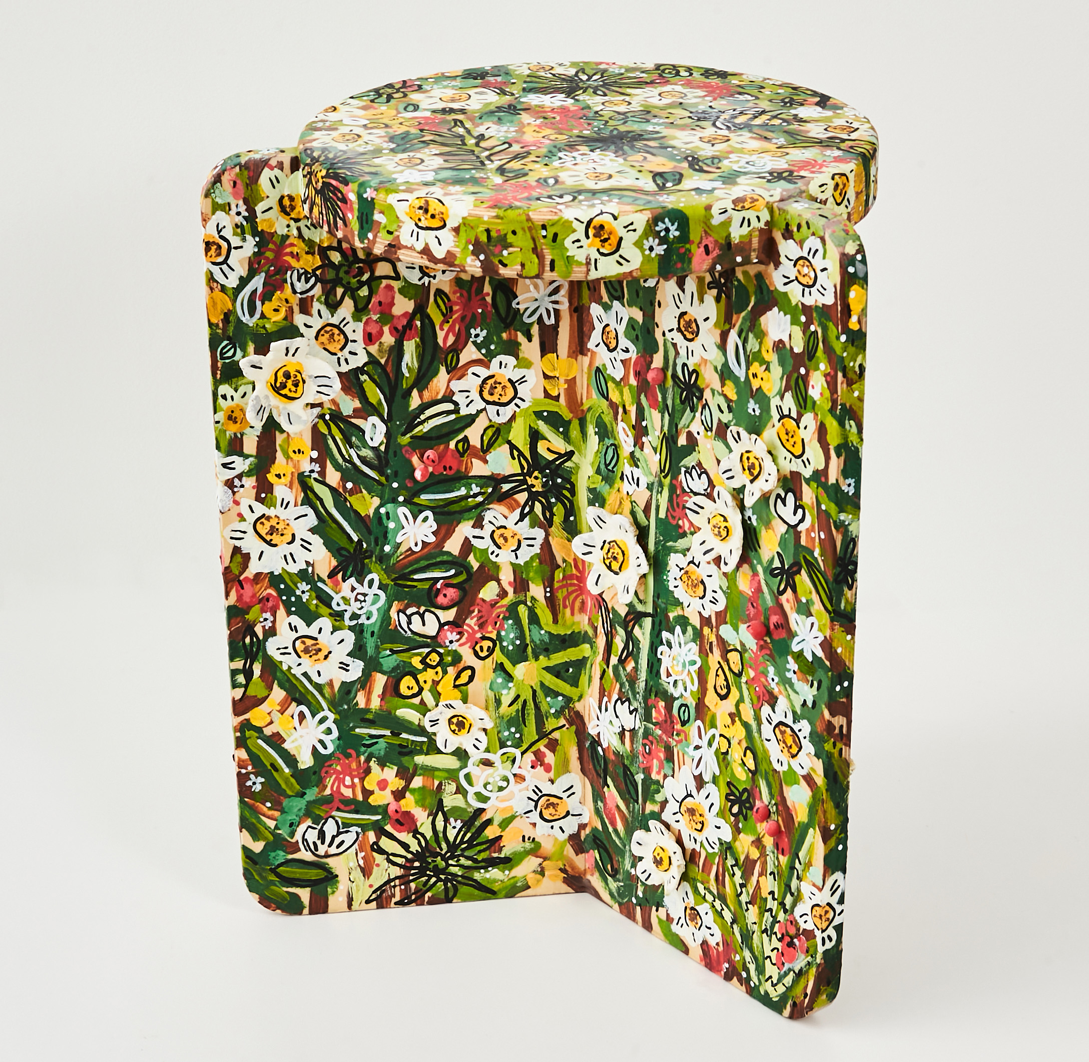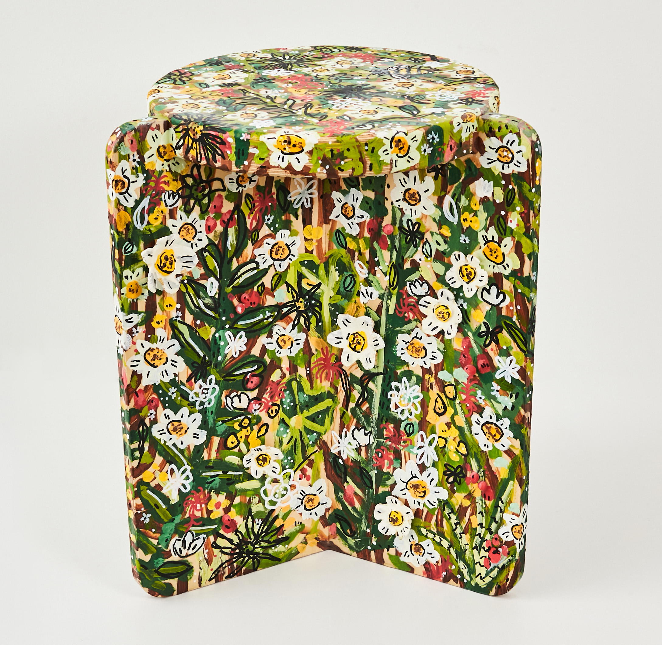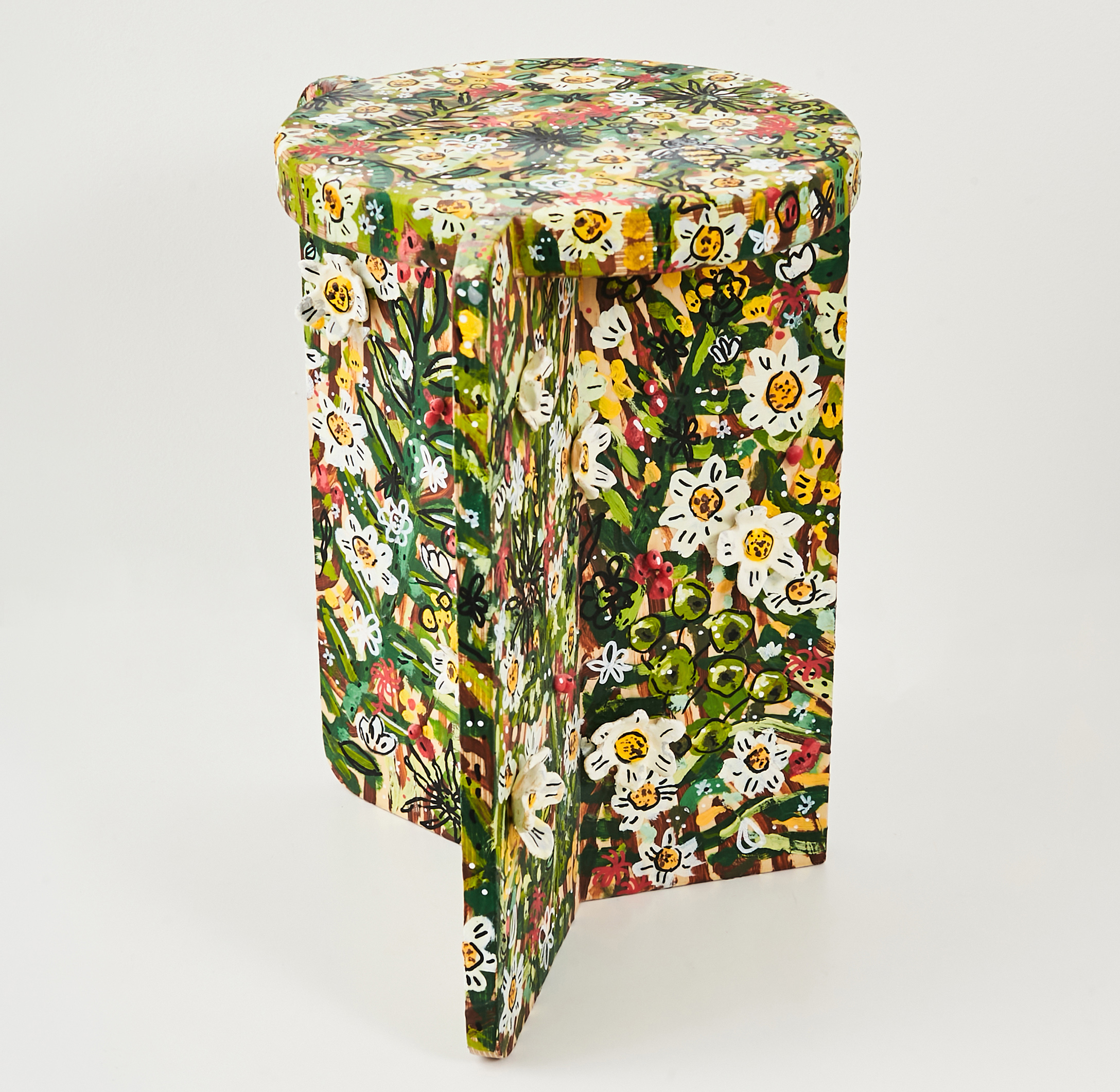 Taking the viewer on a journey through the world of natural beauty, where beauty is nature and nature is beauty, every line and brushstroke on the stool aims to convey a lovely story of imperfection. Nature is formed by the movements of the brushes and markers, translating to how nature develops in the wild, resulting in an artwork which presents a sense of calm among the messiness.