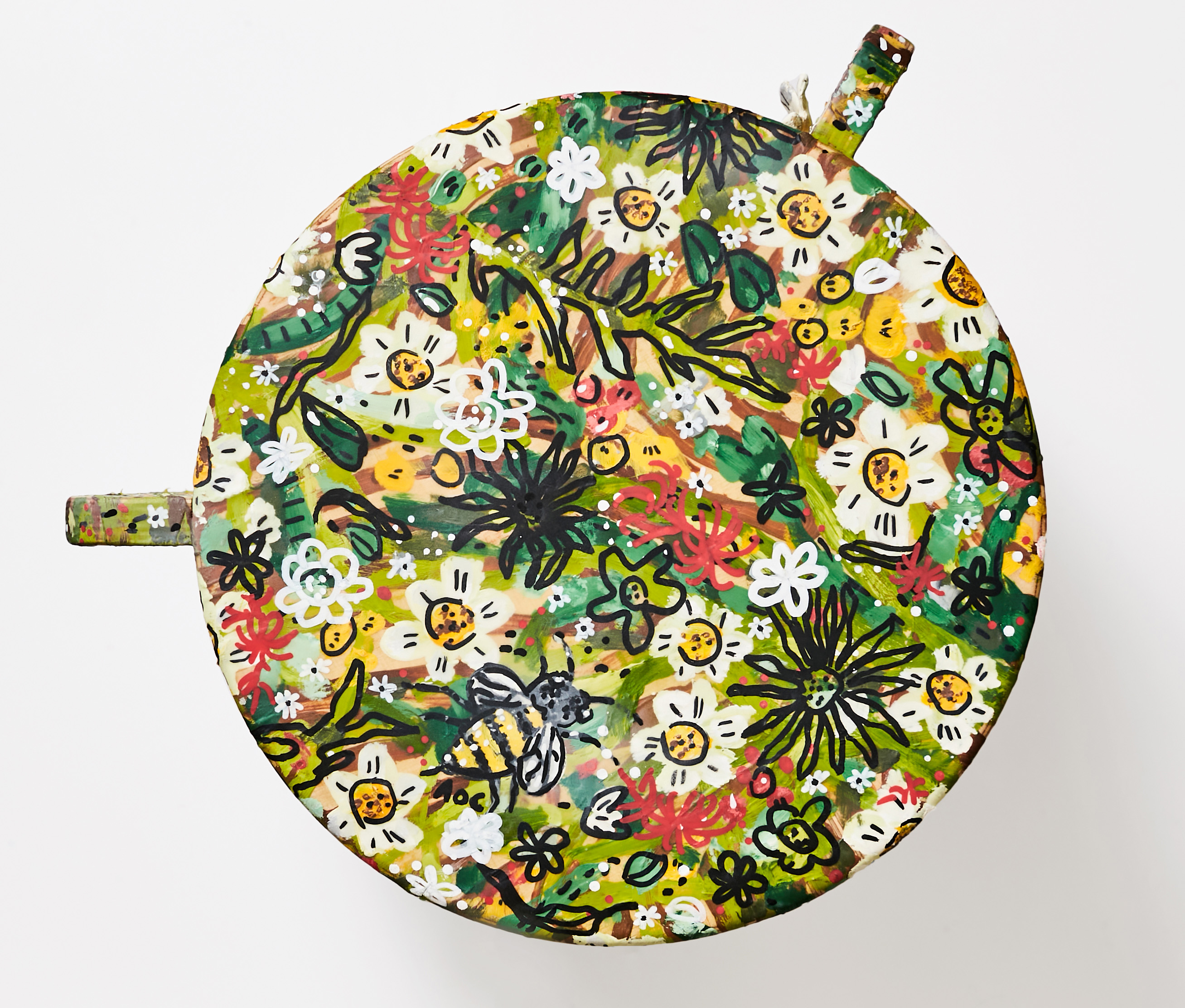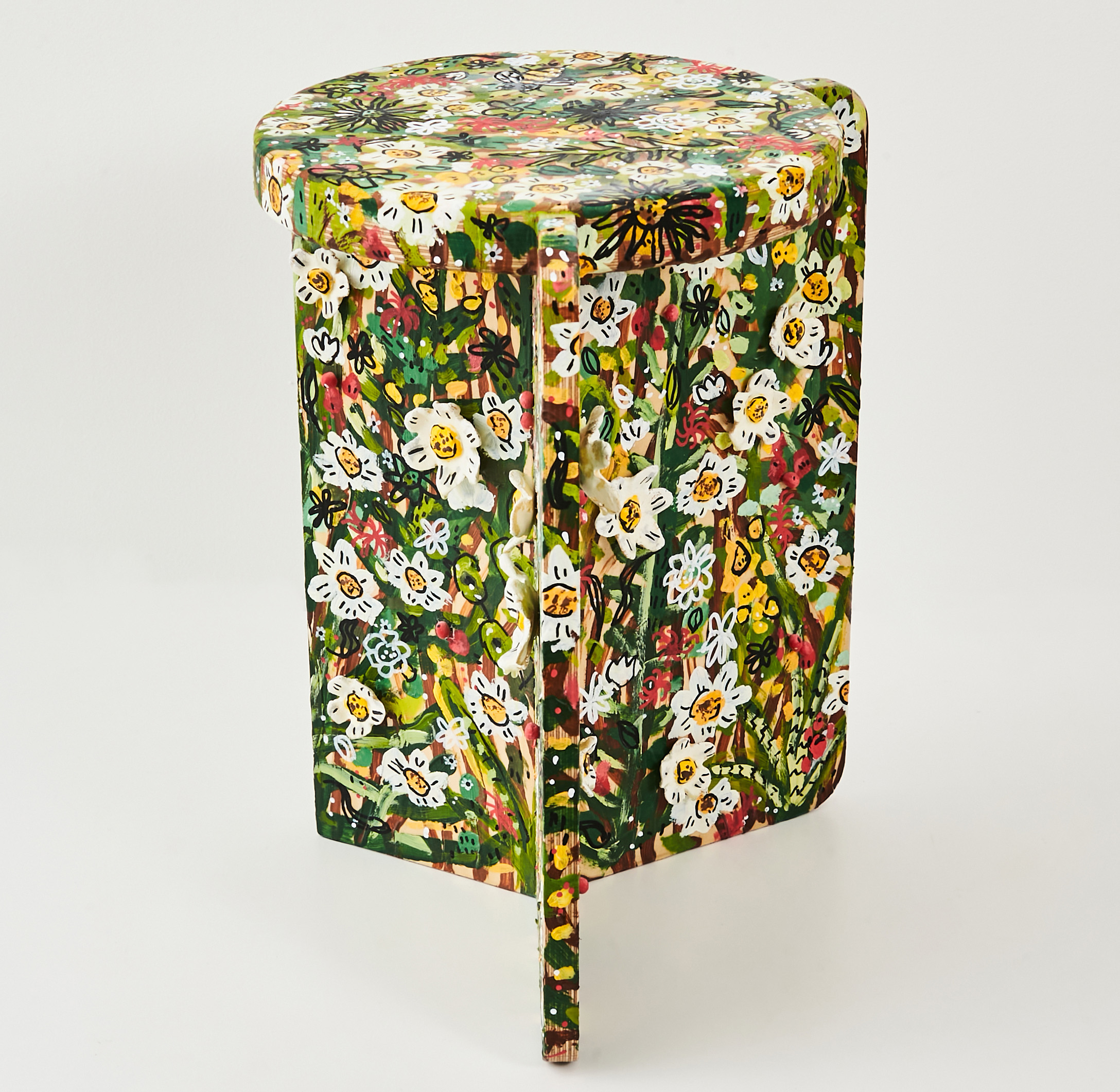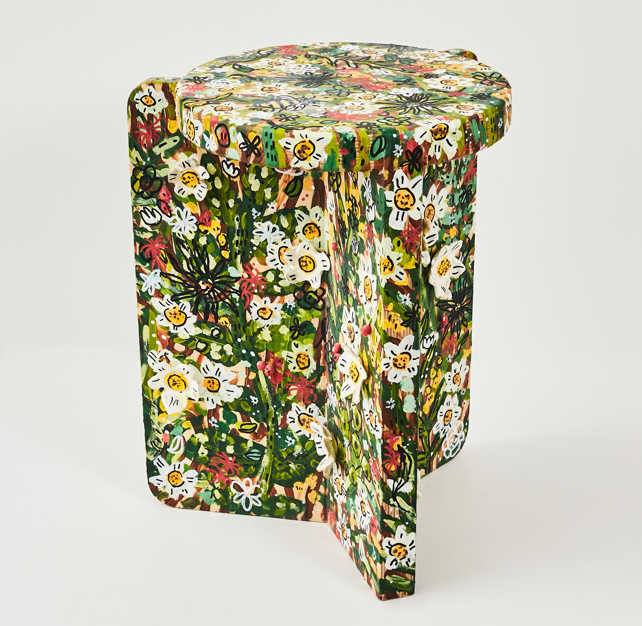 Taking the viewer on a journey through the world of natural beauty, where beauty is nature and nature is beauty, every line and brushstroke on the stool aims to convey a lovely story of imperfection. Nature is formed by the movements of the brushes and markers, translating to how nature develops in the wild, resulting in an artwork which presents a sense of calm among the messiness.
