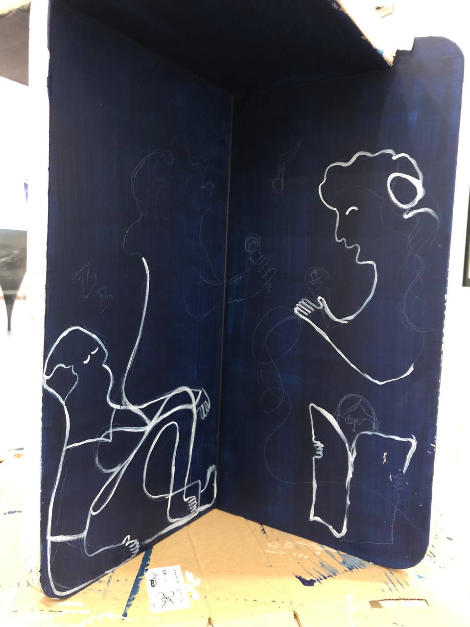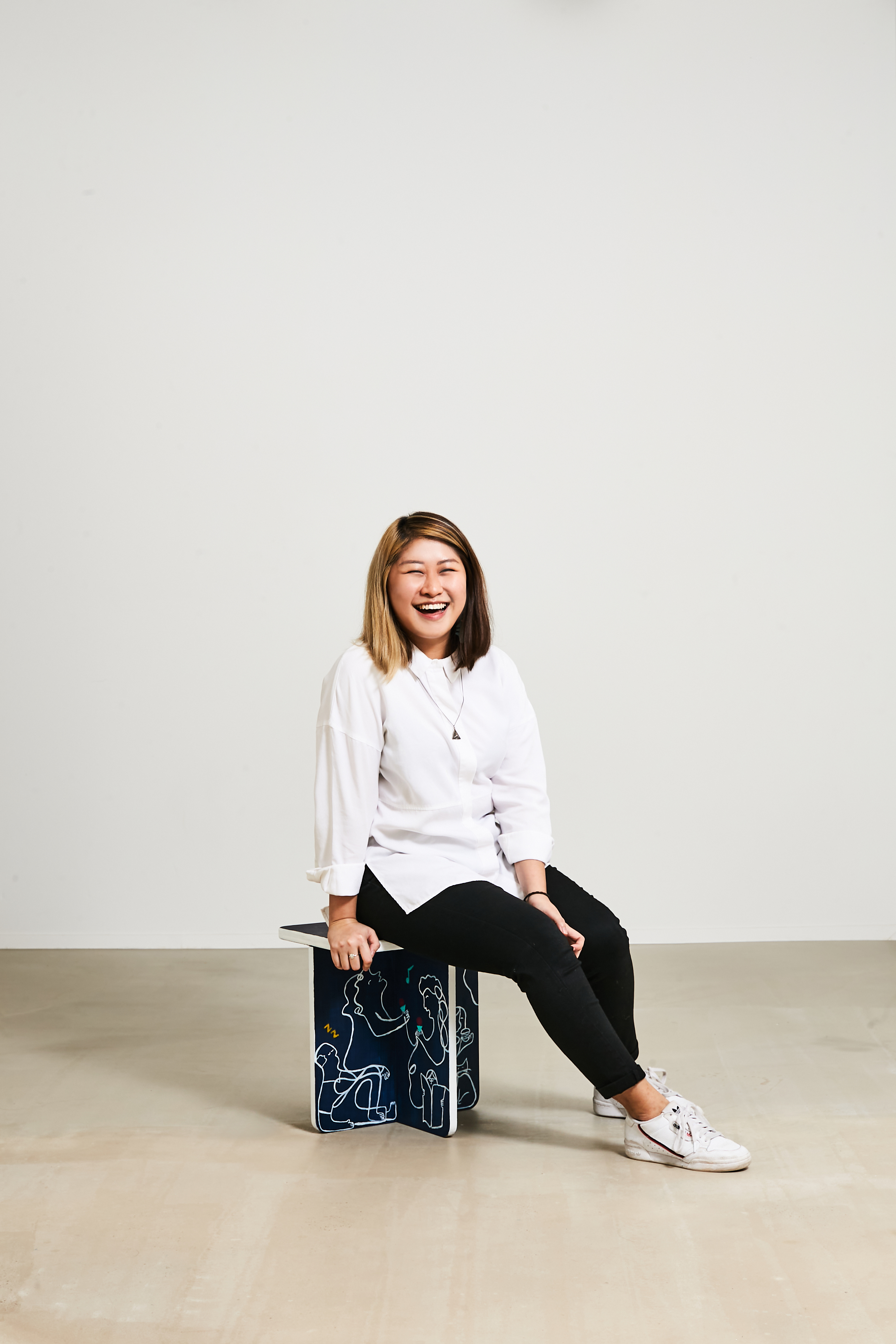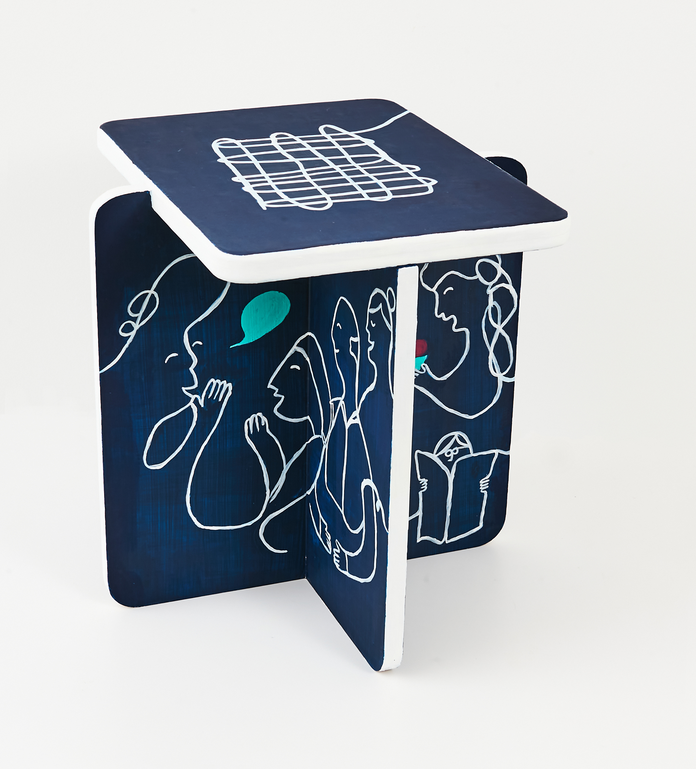 As a meeting point for many people of diverse backgrounds to gather - be it for meals, to have some quiet time, or to play football with neighbours - the void deck serves as a symbol of community. To capture this essence, a single-line drawing is utilized to signify how one place can connect many individuals together. Inspired by the white grouting of the iconic blue-tiled void deck table and seating, the line starts off and forms the chess piece commonly seen on the tabletop. It then flows down the panels of the stool to create the various scenes and activities of the void deck.